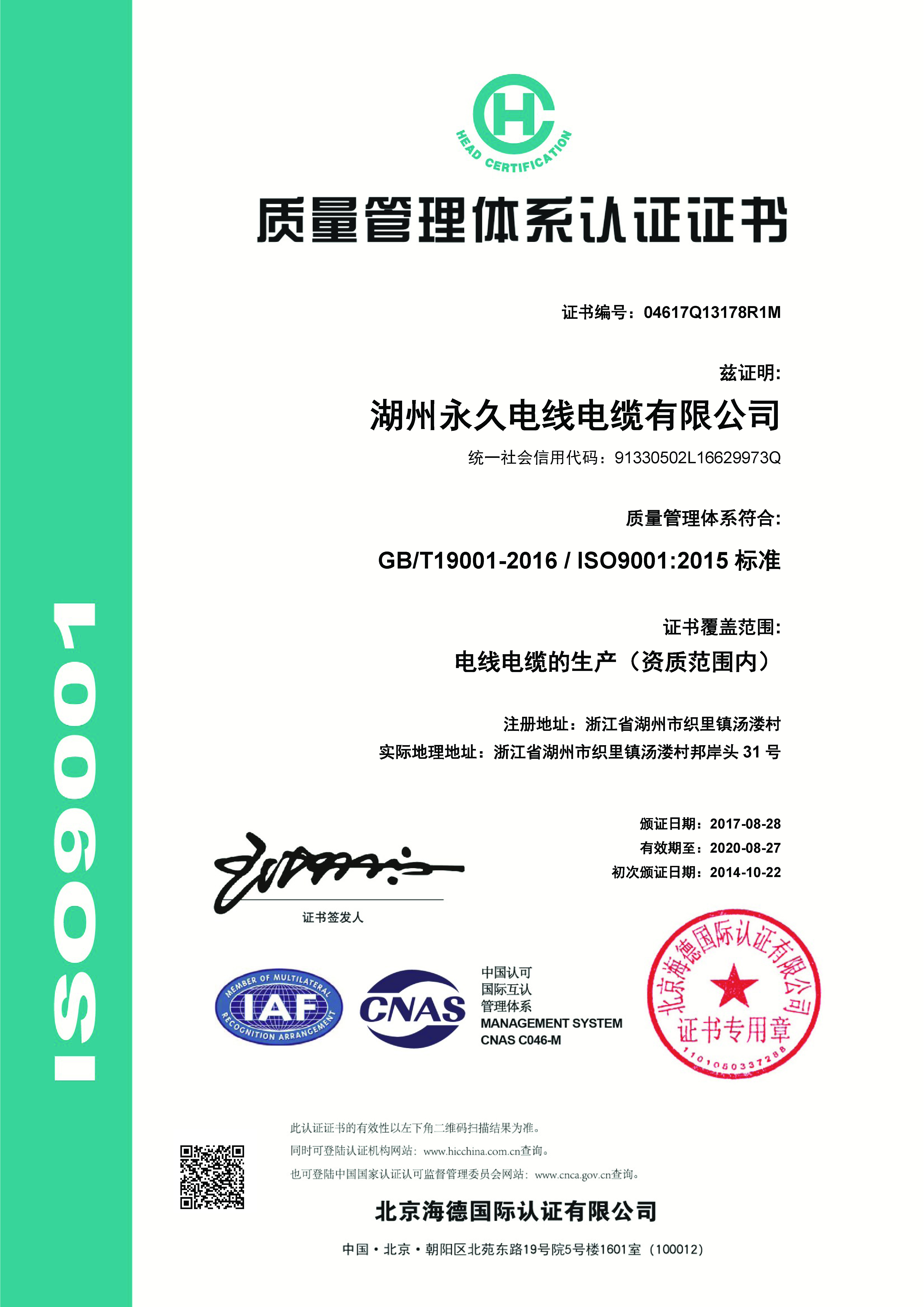 2014年級(jí)獲得ISO9001證書(shū), 并獲得湖州名牌產(chǎn)品--“久永”