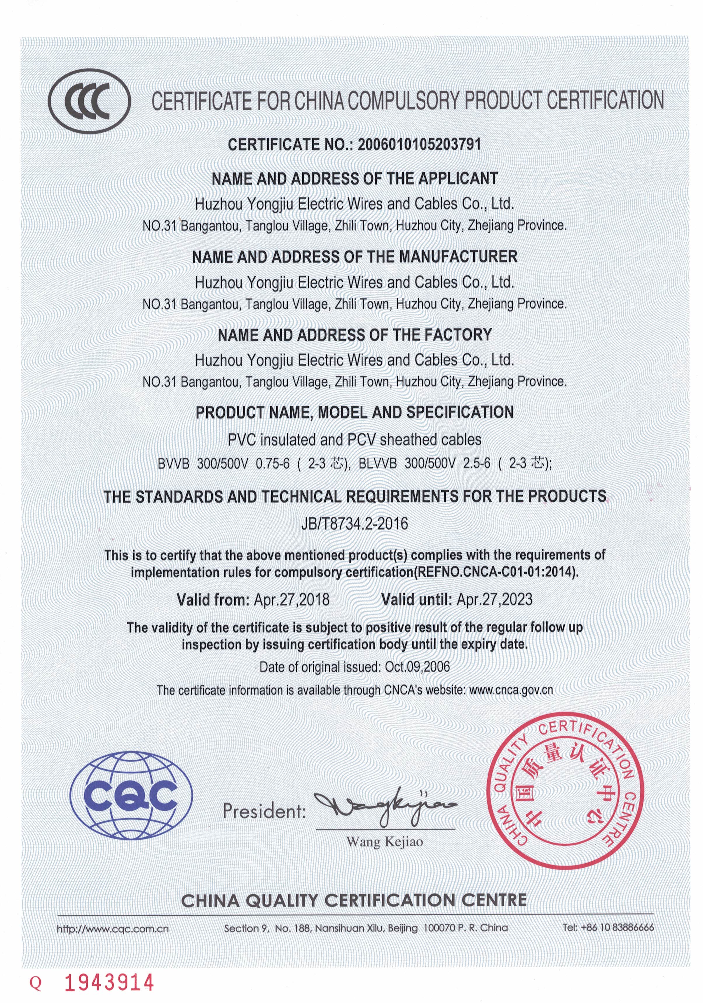2005年, 在王阿志董事長(zhǎng)的帶領(lǐng)下,經(jīng)過(guò)10年的不斷的努力和堅(jiān)持,浙江永久電纜有限公司--正式注冊(cè)成立。