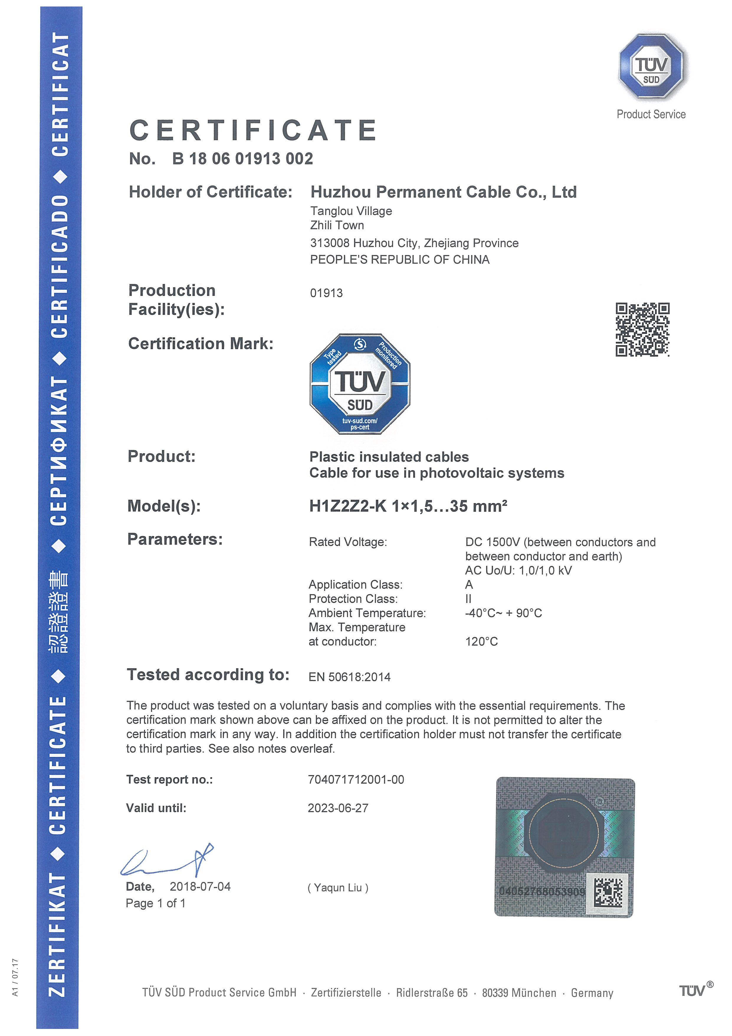 2016年--2018年,我司先后獲得了CE證書(shū)和TUV證書(shū), 通過(guò)了SGS的第三方驗(yàn)廠(chǎng)。2017年-2018年,2年的時(shí)間內(nèi),在新能源領(lǐng)域--光伏電纜, 取得了重大進(jìn)步。
